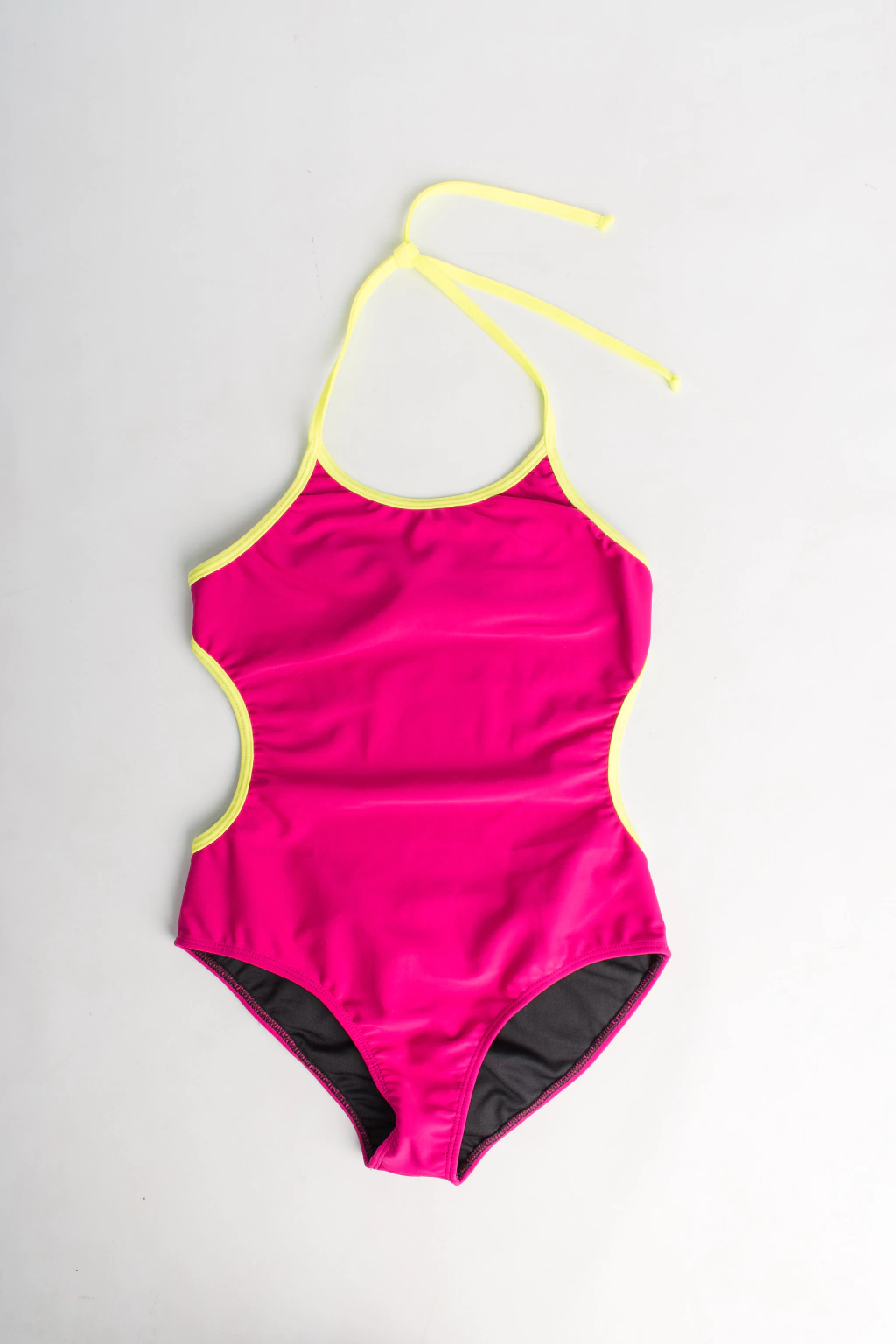- Diseño: Este modelo posee cintura abierta y una espalda que vas a amar! De color MAGENTA, con vivos AMARILLO FLUOR
